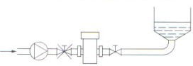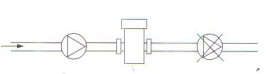 用聚四氟乙烯(PTFE)管材做的電磁流量計的傳感器襯里,它與傳感器測量管管壁一般不粘貼,因此,對真空負(fù)壓是敏感的。管道內(nèi)真空會抽癟聚四氟乙烯襯里,使襯里呈波浪型拱起——典型的負(fù)壓破壞形態(tài),這樣破壞了電極的密封,傳感器就不能工作了。因此,PTFE襯里的傳感器不能用于負(fù)壓系統(tǒng),也應(yīng)盡可能避免安裝在可能產(chǎn)生瞬間負(fù)壓的地方。如傳感器不應(yīng)裝在泵的吸入端;閘閥應(yīng)裝在傳感器的后側(cè),如圖所示。