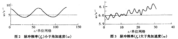 流量計(jì)產(chǎn)生誤差的主要因素是脈動(dòng)流的頻率,所加的正弦脈動(dòng)流的頻率與穩(wěn)態(tài)下渦輪的旋轉(zhuǎn)角加速度的關(guān)系為ω=2πfp(1/qm)r2時(shí),相應(yīng)曲線與輸入正弦曲線最為接近,與理論分析基本吻合,多次改變脈動(dòng)流頻率、振幅參數(shù),發(fā)現(xiàn)有時(shí)圖形失真非常厲害,通過對(duì)多幅圖形的比較,發(fā)現(xiàn)有如下規(guī)律:(見圖2、3)