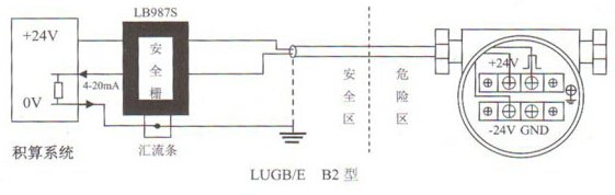 一、輸出頻率信號的三線制渦街流量儀表配線設計 渦街流量計輸出頻率信號的三線制流量傳感器采用DC24V或DC12V電源供電,一般通過三芯屏蔽電纜線(RWP3×0.5mm)與顯示儀表或計算機相連,屏蔽層應可靠地接到放大器殼的接地螺絲上。屏蔽電纜線的選擇應適合現(xiàn)場環(huán)境要求,另外屏蔽電纜線要與其它強功率電力線分離,不能平行走線。 二、輸出標準4~20mA電流信號的兩線制渦街流量儀表配線設計 輸出標準4~20mA電流信號的兩線制變送器采用DC24V電源供電,一般通過兩芯屏蔽電纜線(RWP3×0.5mm)與顯示儀表或計算機相連,屏蔽層應可靠地接到放大器殼的接地螺絲上。屏蔽電纜線的選擇應適合現(xiàn)場環(huán)境要求,外屏蔽電纜線要與其它強功率電力線分離,不能平行走線。 三、帶RS-485通訊接口功能的渦街流量儀表配線設計 帶RS-485通訊功能的渦街流量儀表采用DC24V電源供電,與其它設備之間采用四線制傳輸方式。 四、防暴型渦街流量儀表配線設計 LUGB/E三線制脈沖輸出型渦街流量儀表與LB978齊納安全柵相連、LUGB/E兩線制標準4~20mA電流輸出型渦街流量儀表與LB987S齊納安全柵相連可構成本質安全型防爆系統(tǒng),產品防爆標志為Ex iaⅡCT2-T5。本安防爆型渦街流量傳感器/變送器與防爆安全柵和積算系統(tǒng)等關聯(lián)設備的接線性請參看防爆安全柵廠家提供的接線說明和以下所示圖。 注意事項: (1)防爆型傳感器和變送器安裝于危險場所,安全柵、顯示儀表、供電電源,計算機等關聯(lián)設備必須安裝在安全場所。 (2)傳感器和變送器應有可靠接地,防爆地線不得與強電系統(tǒng)保護接地共用。